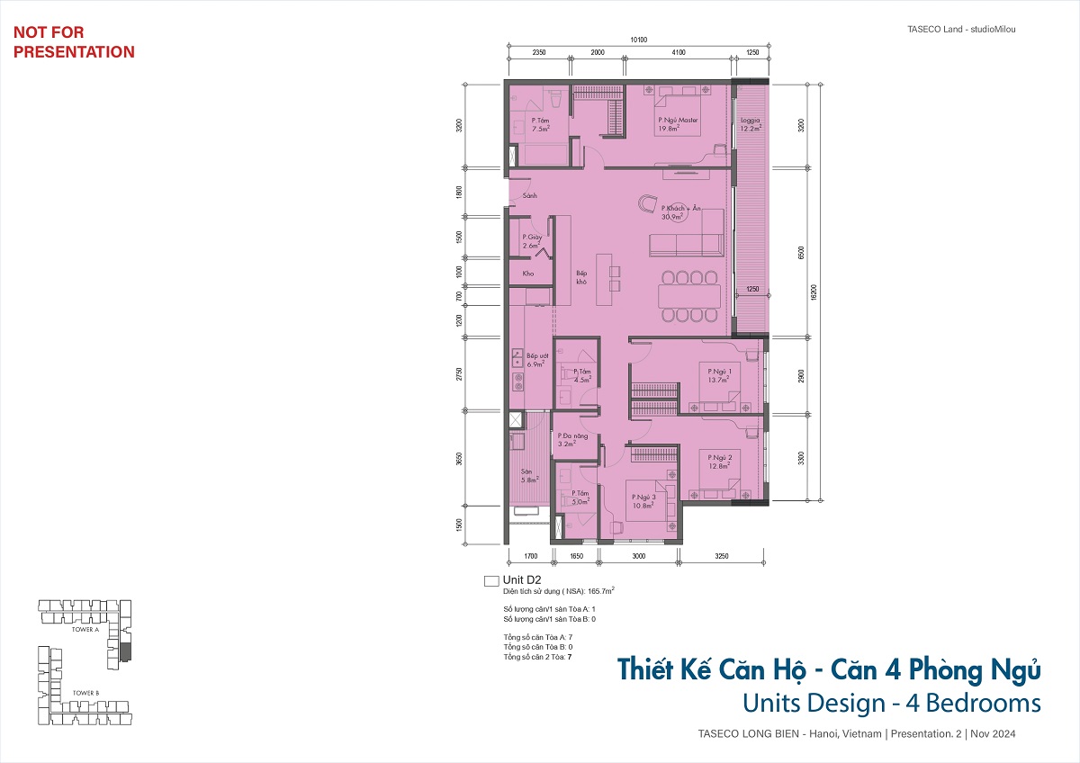 Căn 4 phòng ngủ: 155 – 165 m², dành cho gia đình đa thế hệ.