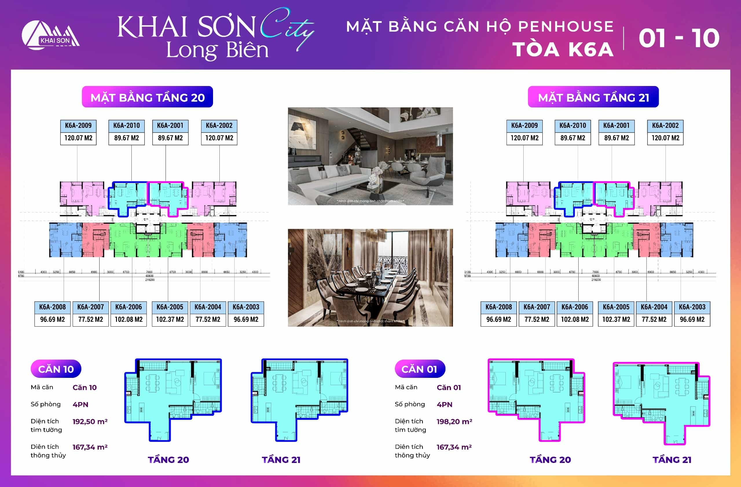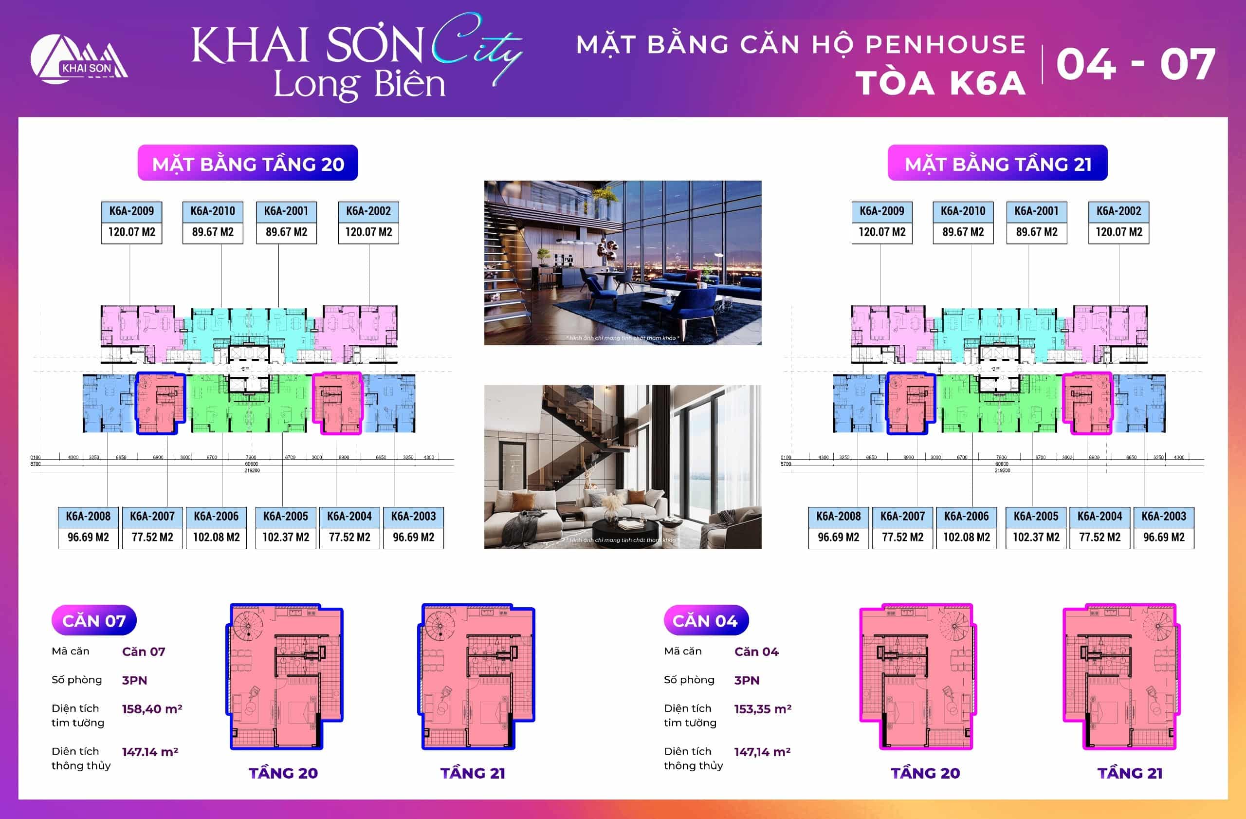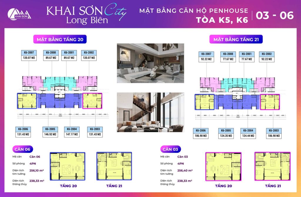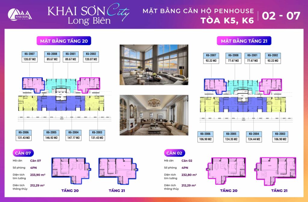 Thiết kế căn hộ Penthouse Khai Sơn City tòa K2, K6A thiết kế có 10 căn hộ tầng 20 và tầng 21 của dự án. Các căn ban công đông nam tòa K2 là căn 03, 04, 05, 06, 7, 8 Các căn ban công Tây bắc view sông đuống là căn 1,2, 9, 10
