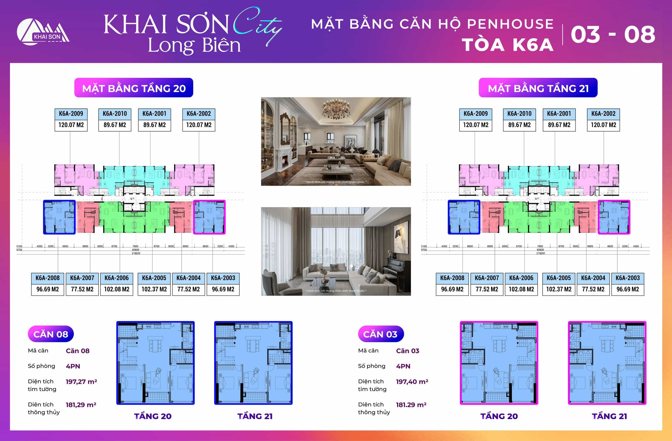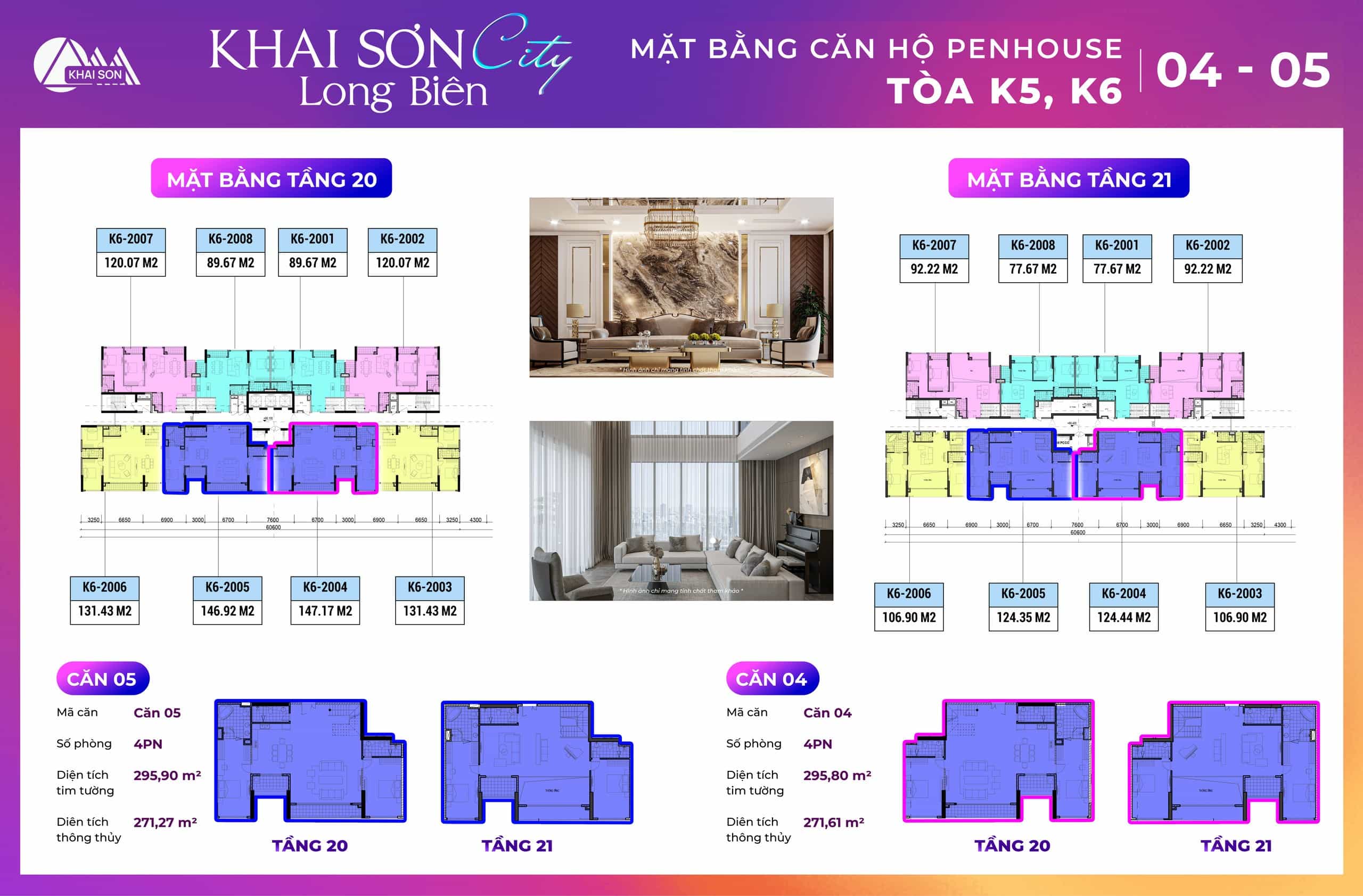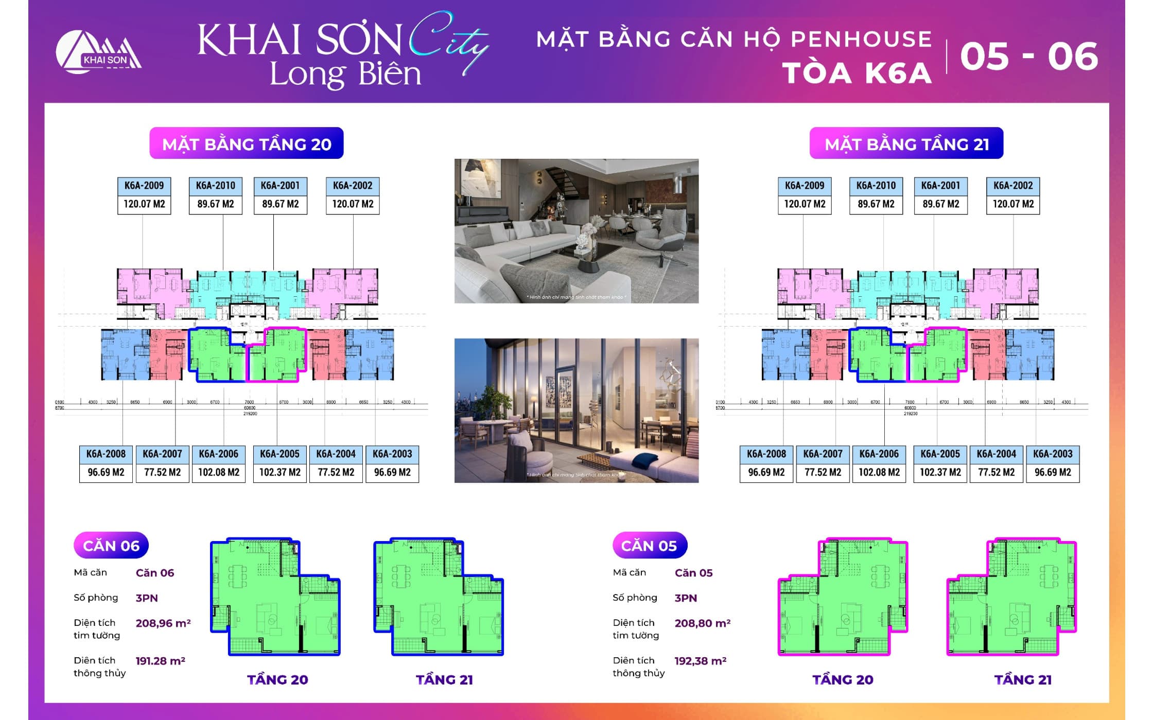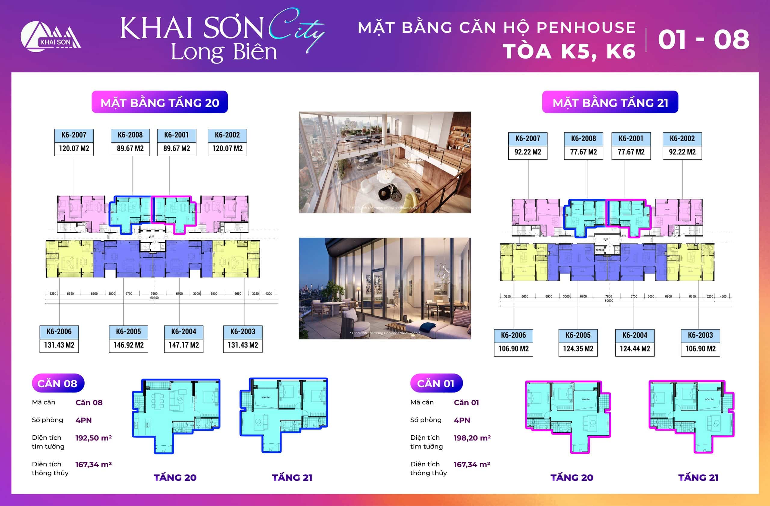 Thiết kế căn hộ Penthouse Khai Sơn City tòa K2, K6A thiết kế có 10 căn hộ tầng 20 và tầng 21 của dự án. Các căn ban công đông nam tòa K2 là căn 03, 04, 05, 06, 7, 8 Các căn ban công Tây bắc view sông đuống là căn 1,2, 9, 10