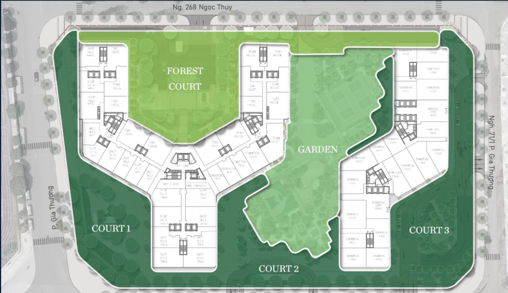 - Podium (1–5): Tiện ích, shophouse, garden townhouse